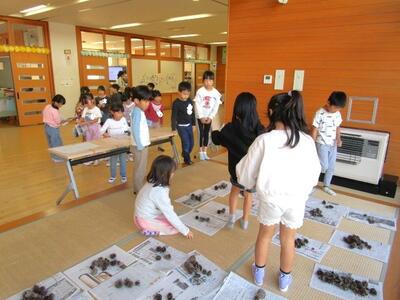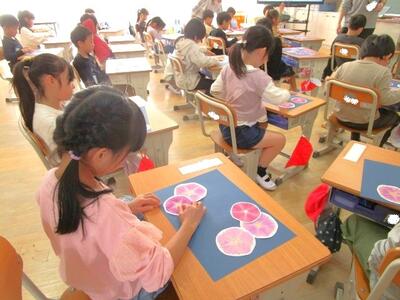 【1年生】1枚目の写真は、生活科の学習の様子です。夏に育てていたアサガオは、種をとるだけではありません。押し花にしていた花を、きれいに色画用紙に貼っていきます。