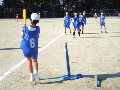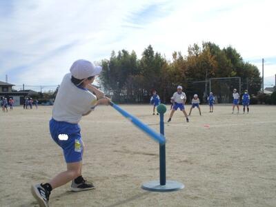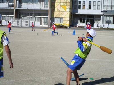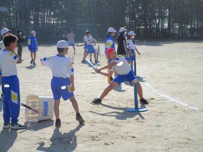 【5年生】1枚目と2枚目の写真は、体育の「ティーボール」の学習の様子です。止まっているボールなのですが、なかなかバットに当てるのは難しいです。ボールをしっかりと見て打つ練習を行っていました。