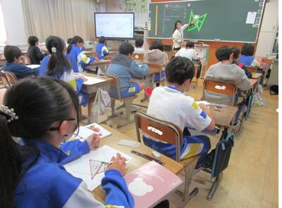 【4年生】1枚目と2枚目の写真は、算数の「直線の交わり方やならび方に注目して調べよう」の学習の様子です。今日は、平行や垂直の線を描く練習をしていました。