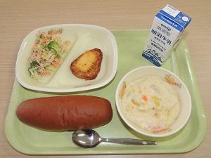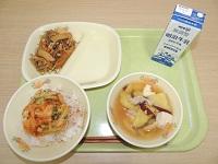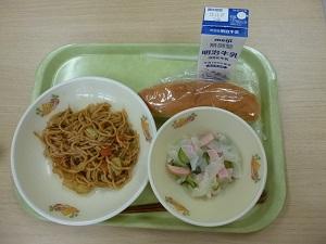 今日の献立は、「はちみつパン、牛乳、じゃがいもいりやきそば、だいこんサラダ」です。628キロカロリーです。
