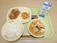 今日の献立は、「ごはん、牛乳、ぶたにくのしょうがやき、ほうれんそうのごまあえ、けんちんじる」です。619キロカロリーです。