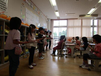 音楽ではリズムをうつ学習をしていました。たん・たん・たんとリズムを打つときと、うんと休む時があることを勉強していました。