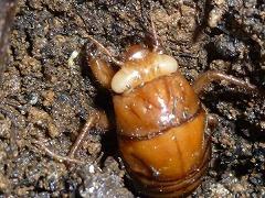現在校舎建築工事が急ピッチで行われています。プール西側も側溝工事のため、歩行しづらくなっています。深く掘り進められた側溝をのぞいていたら、セミの幼虫を発見しました!!急にまわりが明るくなって大慌ての様子です。工事関係者の方にお願いして拾い上げていただきました。トマトの枝にぶら下げたら羽化するかなと思ってトライしたら、すぐに落下・・・。仕方なく校長室まで持ってきて、アジサイの鉢植えにおいてみたら、何と!!いきなり穴を掘り始めました。職員研修があるため、そのままにして出かけましたが、帰ってのぞいてみたら・・・、すっかりもぐり込んでいました!!セミは6年から17年ぐらい地中で過ごすそうです。「羽化してから1週間ぐらいしか生きられない」と聞かされていましたが、実際には1ヶ月近く生きているらしいのです。ちょっと狭いお家ですが、また地中の生活にもどってくださいね!!