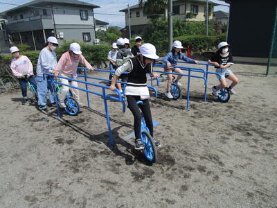 午後になると天気も回復し、昼のロングフリータイムは多くの児童が外遊びを楽しんでいました。校庭の東側には一輪車用の手すりがあるところがありますが、たくさんの子どもたちが一輪車の練習をしていました。一輪車はバランスをとるのが大変難しく、乗るのに苦労している児童が目立ちましたが、それでも、何回も何回もチャレンジしながら少しずつ「コツ」をつかんでいるようでした。上級生になるとうまく乗りこなすことができる児童もおり、校庭を楽しそうに一輪車で移動していました。
