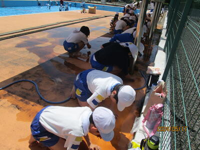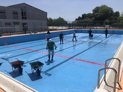 5月11日(土)9:00~、PTA事業部の皆様によるプール清掃を実施していただきました。