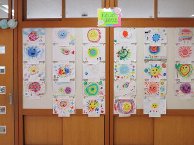1年生のクラスの廊下を歩いてみると、図画工作の作品がきれいに掲示されていました。題名は「わたしのおひさま」です。子どもたちの創造性あふれる力作ばかりです。