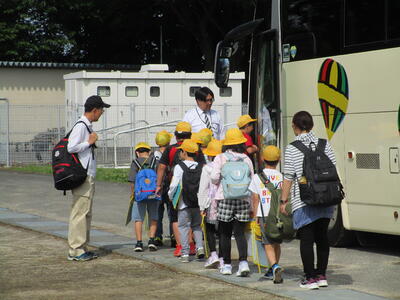 あいにくの雨となりましたが、バス2台に分乗して幼稚園に出発しました。
