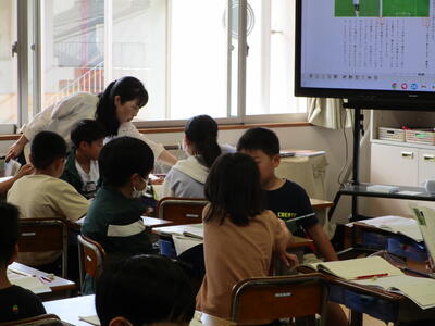 また、1年生では「国語」や「算数」の授業が行われていました。1年生も5月になり各教科の授業が進められています。手をまっすぐにあげたり、本を読む姿勢を意識したりしながら、積極的に学習に取り組んでいます。また、算数ではドリル問題に取り組み、先生に丸をもらっていました。