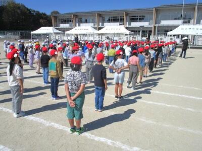 あいにくの小雨で、中断をはさんで、予定していた種目を実施することができました。子どもたちにとっては初めての赤白に分かれての競い合う運動会です。応援も雨を吹き飛ばすくらいの大きな声を出して行っていました。子どもたちは練習の時以上の素晴らしい演技や頑張りを見せてくれました。雨のための中断で保護者の皆様には、御心配やご迷惑をおかけいたしました。