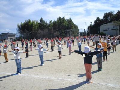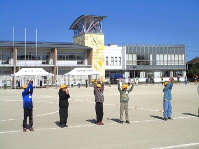 【1・2年生】昨日の開会式やラジオ体操の復習をしていました。隊形を変えることは難しいことですが、だんだんとできるようになりました。