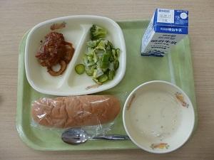 今日の献立は、「こめこパン、牛乳、ツナマヨオムレツ、ひじきのサラダ、しろいんげんまめのポタージュ」です。