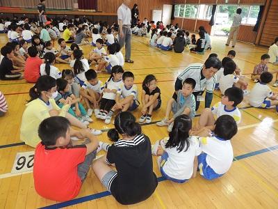 運動委員会の児童による進行で行われました。阿小っ子の合言葉「自分で 自分から」ですね。6年生代表による模範泳法もすばらしかったです。
