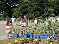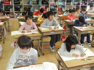 3時間目は生活科の「やさいのせわをしよう」で、自分で選んだ野菜の苗を、自分の鉢に植えました。支柱を立てたり、観察カードに記録したりしました。工夫して長さを測ったり、葉の数を数えたりしていました。2年生は、友達や先生にわかりやすいように「自分で自分から」工夫して観察カードをかいていました。