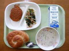 こめこパン、牛乳、コロッケ、くるみあえ、クラムチャウダー