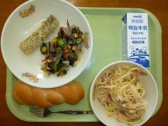 ツイストパン、牛乳、いかのハーブやき、かいそうサラダ、ベーコンとキャベツのスープスパゲティ