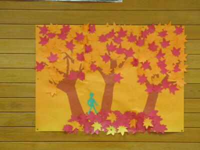 校舎内の掲示物も紅葉のものに変わっています。と、同時に校庭の木々も少しずつ色づき始めているようです。