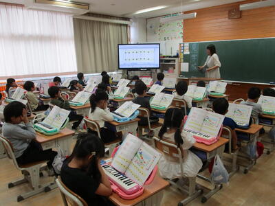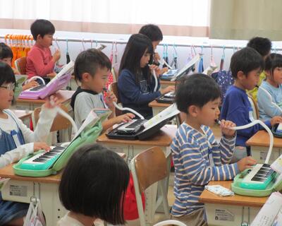音楽では、鍵盤ハーモニカを使って音を出していました。
