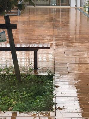 しかし、子どもたちの登校後は再び雨が降り始めました。中庭のウッドデッキも雨に濡れています・・・