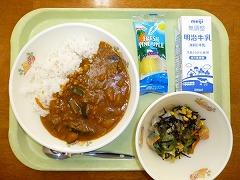 むぎごはん、なすとかぼちゃのカレー、こんにゃく入りかいそうサラダ、れいとうパイン