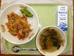 ぶたキムチどん(ごはん、ぶたキムチどんのぐ)、牛乳、えだまめ、ワンタンスープ