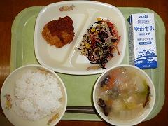 ごはん、牛乳、チキンカツナゲットソースがけ、ひじきのサラダ、かんぴょうボール入りはくさいスープ