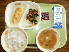 むぎごはん、牛乳、てんぐにらまんじゅう、ぶたにくのキムチいため、ほたてととうふのスープ