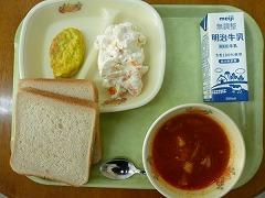 ポークカレーは、にんじんとじゃがいもが同じ大きさにカットしてあり、1年生にも食べやすいです。最初は甘くて、後からスパイシーな辛さがひろがります。フレンチサラダは彩りもきれいで、雨模様の今日の天気を吹き飛ばしてくれそうです。カレーのデザートにはやっぱりヨーグルトがベストマッチです。さわやかな酸味と甘さでとても美味しいです。