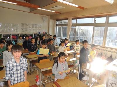 朝の歌(高根沢町の歌)が終わって、子どもたちの健康観察です。「はい!元気です。」「名札OK!」