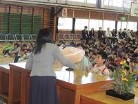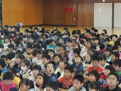 離任式です。ありがとうございました。2~6年生が参加しています。