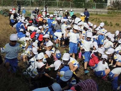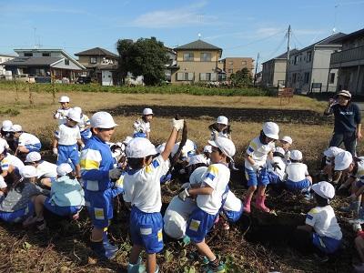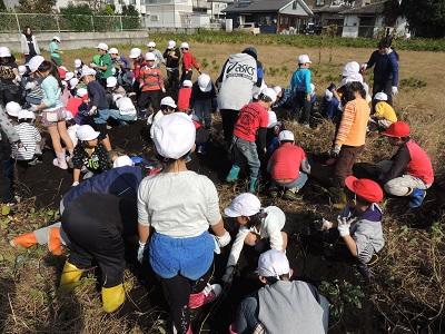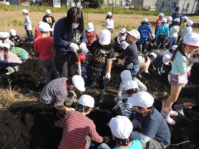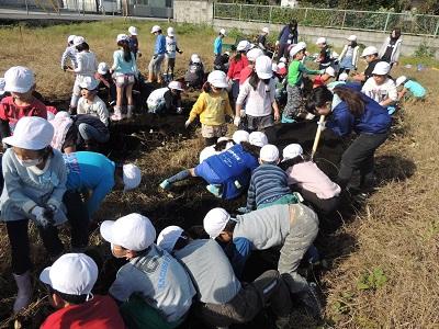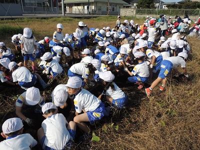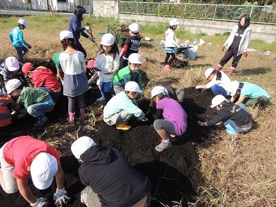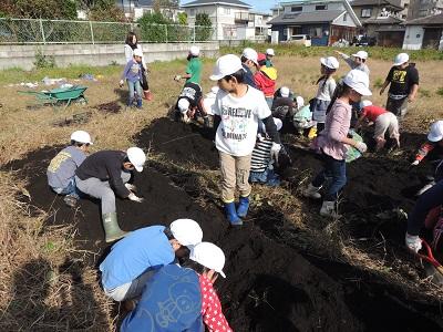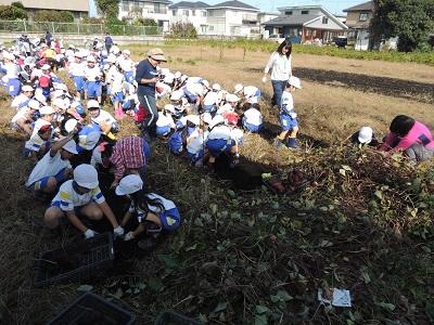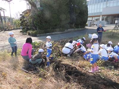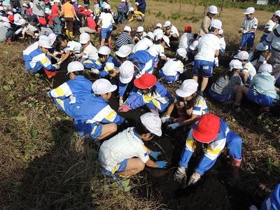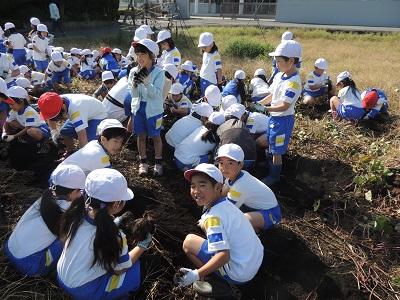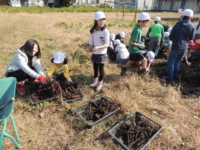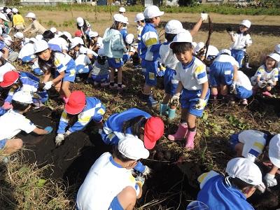 1・2年生の3校時です。さつまいも掘りです。