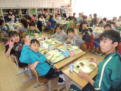 2年3組の給食の様子です。おいしい給食で、元気いっぱいです。