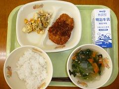 ごはん、牛乳、ぶたソースカツ、ゴーヤチャンプル、とうがんスープ