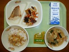 ごはん、牛乳、あかうおのかすづけやき、ごもくまめに、かんぴょうのたまごとじじる、ふりかけ