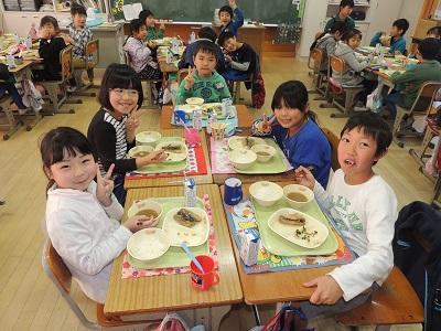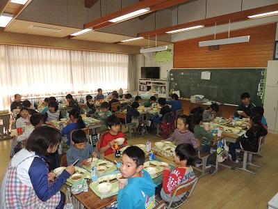 3年1組の給食の様子です。マイ・チャレンジの中学生も一緒です。