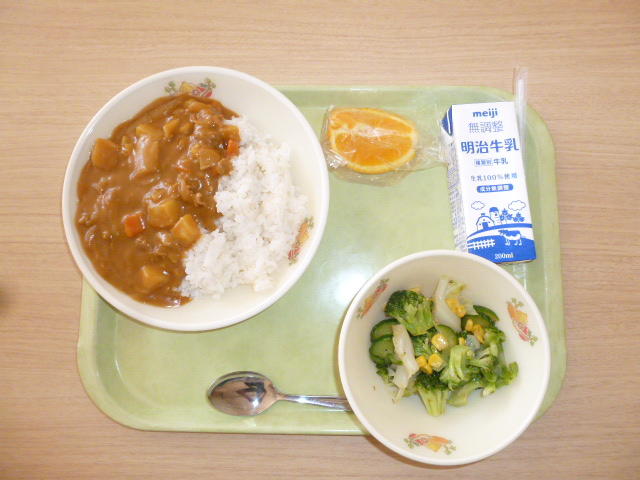 ポークカレー、麦御飯、ブロッコリーのサラダ、オレンジ、牛乳です。647k㎈です。明日は「カミング30デー」です。本校では、毎月3のつく日(3日、13日、23日、30日)を「カミング30デー」として、一口で30回以上噛むことを目標としています。入学間もない1年生が、1口30回噛んでいると食べ終わりませんが、2年生以上はなるべくたくさん噛むようにしたいものです。