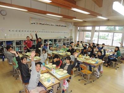 6年生が修学旅行でいません。5年生が給食の放送、国旗当番、給食の片付け等をがんばっていました。
