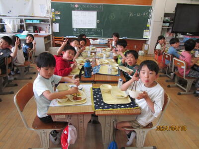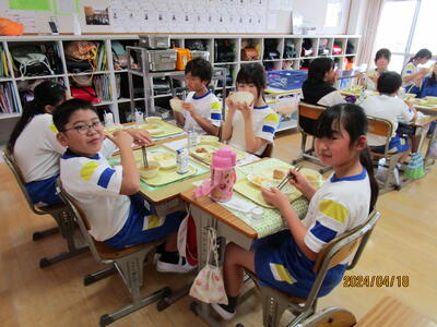 みんなで食べる給食は、おいしいですね。笑顔が素敵です。
