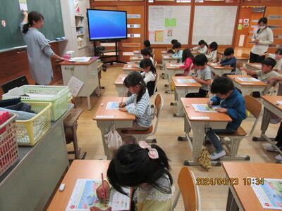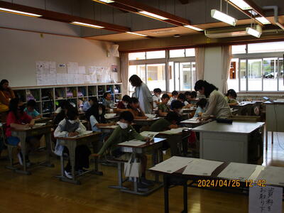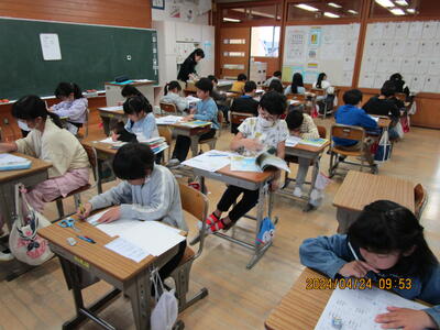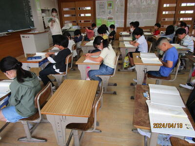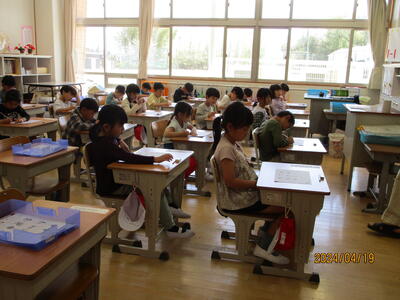 調査問題が配られると、どの児童も真剣な表情で目の前の問題に最後まであきらめず、精一杯取り組んでいました。