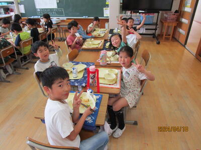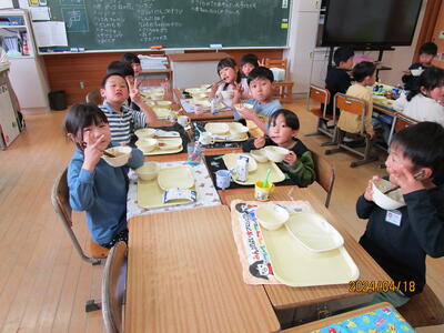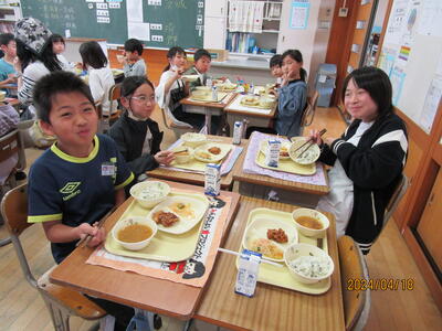 みんなで食べる給食は、おいしいですね。笑顔が素敵です。