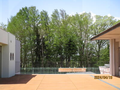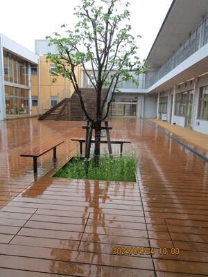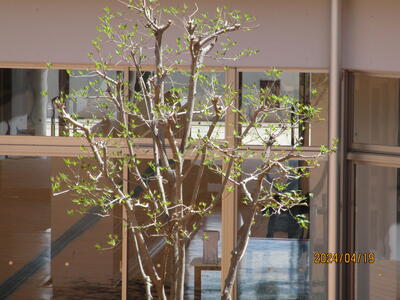 校庭西側の樹木の緑も日増しに濃くなってきています。中庭のシンボルツリーも新芽が出てきました。