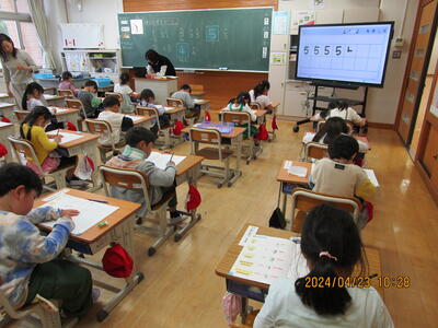 算数は、2桁のひっ算を行っていました。素早く問題を解き、先生に丸を付けてもらっていました。