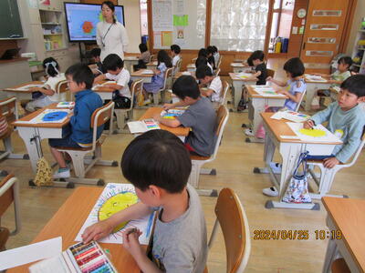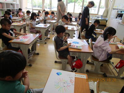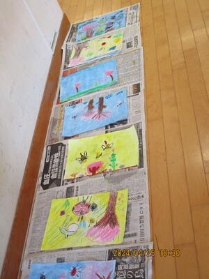 また、図画工作では、春にまつわる絵をかいていました。ピンクや黄色、黄緑色などの色づかいが素敵で、春らしい作品がたくさん完成していました。