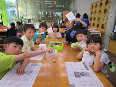 子どもたちは色画用紙を頭上に掲げ、撮影が始まりました。撮影自体は大変手際よく、3分程度で終了しました。