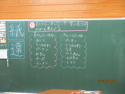 今日は、2年生の学級において、学校栄養士の先生と連携して食に関する指導が行われていました。「すききらいをしないで、食べることの大切さを考えよう」というめあてでした。