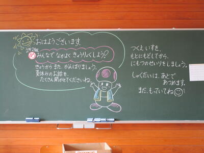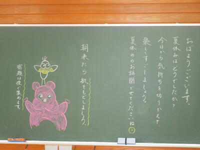 早朝、各教室を回ってみると、どの教室にも黒板に「1学期後半スタートメッセージ」が書かれていました。全部は紹介できませんが、どれも子どもたちの励みになるような内容でした。
