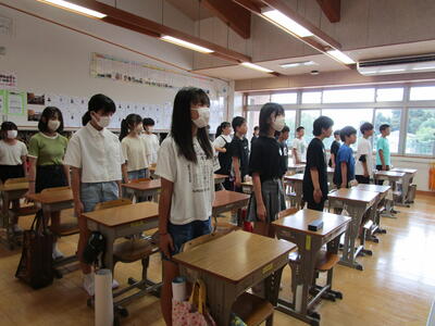リモートによる集会でしたが、会の最初と終わりには司会の先生の号令できちんと、「起立・礼・着席」ができていました。こういうことがしっかりできる阿小生は、大変立派です。