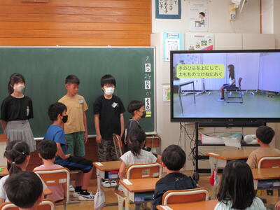 5・6年生の保健委員会の児童が1年生教室を訪問して、説明を行いました。今回は、保健委員会で「動画」も作成したので、それも併せて使いながら説明を行っていました。