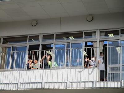校舎2階から、6年生の皆さんが盛大に?見送ってくれました。