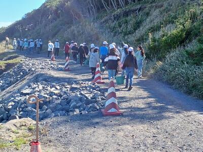 坂を下って海水をくみに行きました。波が高いため先生方が海水をくんで、塩づくりの準備です。