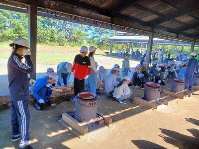 暑い中、火おこしのコツを教わりながら頑張っています。